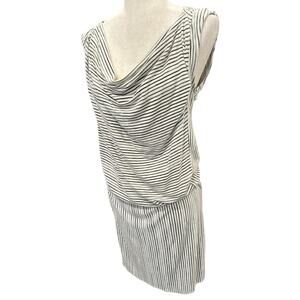 Good preowned condition Derek Lam dress is off-white with black stripes. Dropped waste for a blouson effect. has is typical for.Derek Lam, this dress is asymmetrical at the bodice. The waist is elasticized. Big boat neck top drapes in front. The left side is gathered at the bus line. Two different shoulder types. See photos. Measurements are taken flat and are approximate.