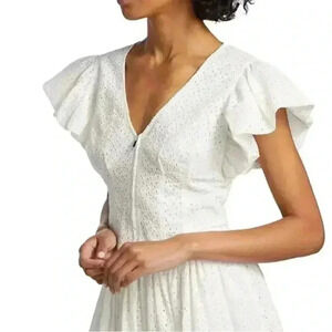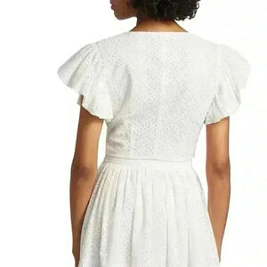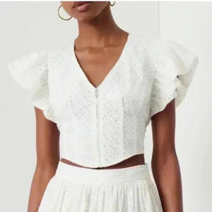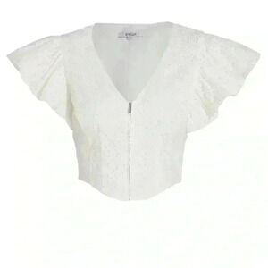 Crafted of cotton eyelet lace, the Genna bustier top from Derek Lam 10 Crosby features a zip-front closure. Voluminous balloon sleeves finish this fitted style. V-neck Short sleeves Zip-front closure Silvertone hardware 100% cotton Dry clean