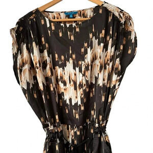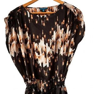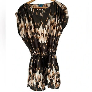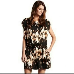 Featuring short sleeves, boat neckline color blocked detail, short mini silhouette side pockets and adjustable drawstring at waist.