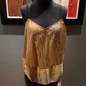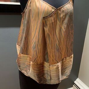 Derek Lam for Design Nation wood grain print silky blouson band hem tank. Asymmetrical overlapping front. Upper edge with inner grosgrain ribbon neckline. Grosgrain ribbon adjustable straps. Medium. 100% polyester. New, no tags. Nonsmoking home.