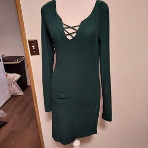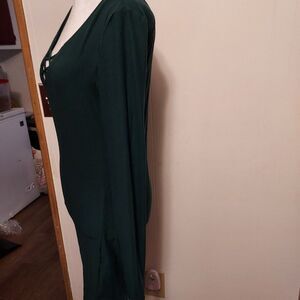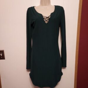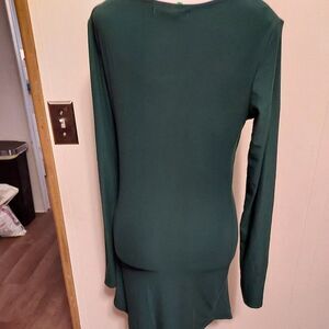 Long sleeve pullover has criss-cross opening light weight 92% polyester 8 % spandex very light has scallop hem arm pit to arm pit 16 1/2 inch shoulder to hem 34 1/2 inch