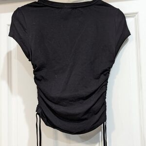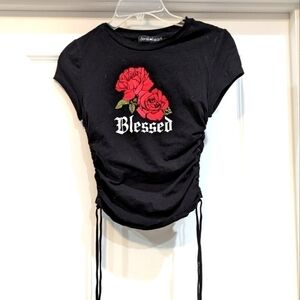 Derek heart blessed black crop top with red roses, size small, gathered rouching on sides with strings, never worn