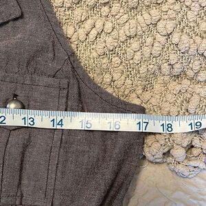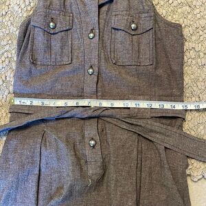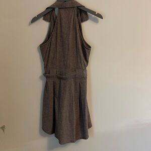 A brown cotton/spandex blend sleeveless dress with belted waist. Neckline has a collar. Button front.