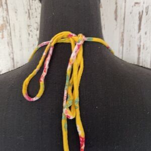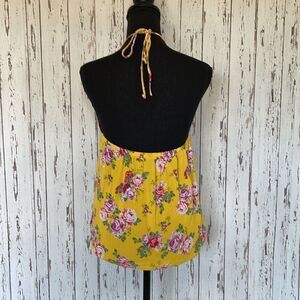 Yellow floral halter top in excellent condition! Bottom hem in front is elastic and ruched for a semi cropped look.
