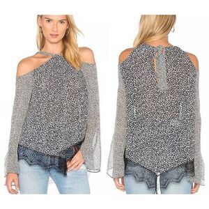Derek Lam 10 Crosby Silk Halter Neck Cold Shoulder Flowy Blouse with Lace Trim Black and White Size 8