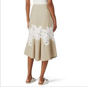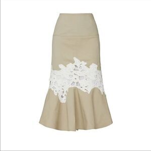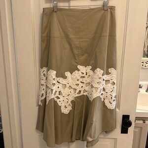 Khaki brown twill (98% Cotton, 2% Spandex). Skirt. Hidden side zipper. Hook-and-eye closure. Fully lined. 32.25'' from waist to hemline. ~31” waist
