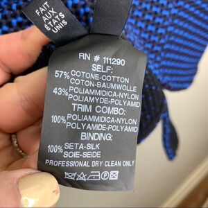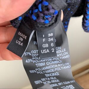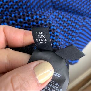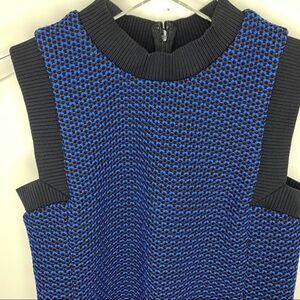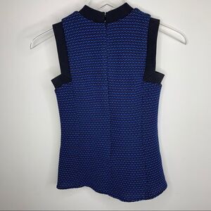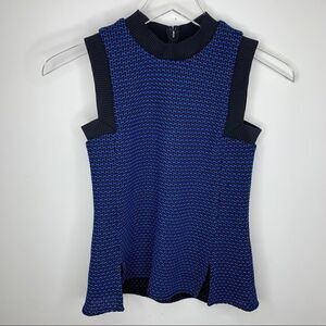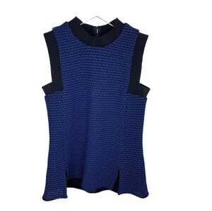 Derek Lam Women’s Black and Blue Woven Knit Mock Turtleneck sleeveless Top w/Slight Peplum waist. 1/4 back zip. Great for career/office/work paired with black pants, skirt or even long shorts. Look put together effortlessly. 1/4 zip back. Pit to Pit 14“ Length 21“ Please see photos for additional details.
