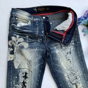 NWOT. Distressed Metal Studs Jeans for Juniors/Women Various Sizes. Zipper and button for closure, 5 pockets design, metal studs right side, "whiskering" effect, distressing with mesh at knees, "paint splatter" design, zipper style leg openings, medium wash, has loops. Please note, there is no internal material/care tag. Pictures are part of description.