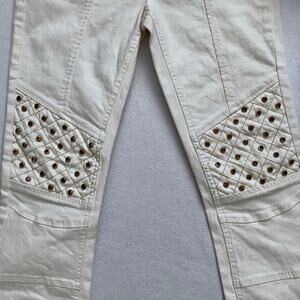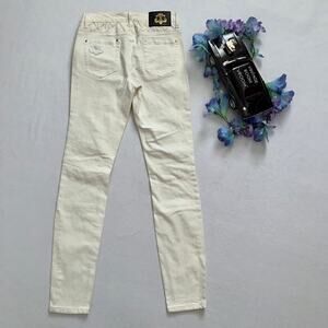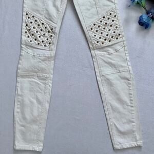 NWT. Ivory Skinny Jeans for Juniors/Women Size 5/6. Zipper and button for closure, 5 pockets design, has loops, ivory wash, front thigh gold faux zippers with brand logo only for style, gold rhinestones on top of pleather material towards knees and back waist, seam designs on knees, embroidered brand logo back left pocket. Please note, internal material/care tags are missing. Pictures are part of description.