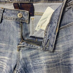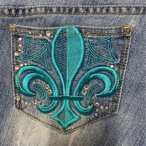 These straight leg jeans have a distressing wash on it. Traditional five pocket denim with a metal Fleur de Lis on the front pocket. The back pockets have teal colored, embroidered Fleur de Lis and rhinestone studding throughout.