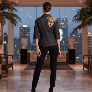 Be casually chic in this unique design from Beyonce's Dereon line. Features a cropped style length with short sleeves, adjustable belt, zip/ button closure with gold tone accents. Great pre-loved condition. Never worn since purchased. Tag size L.