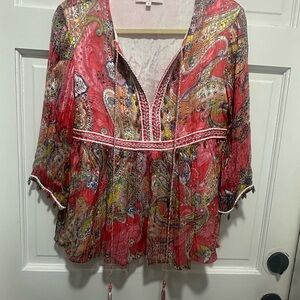 Vibrant paisley top in red, perfect for adding a pop of color to your wardrobe. Features a flattering fit and intricate detailing.