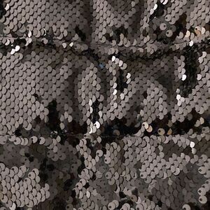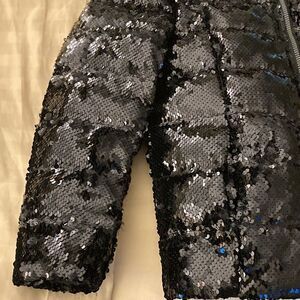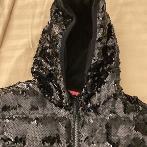 Derby Kids black sequin puffer jacket with hood, full front zipper, 2 side pockets, long sleeve and fleece like lining. All over black sparkly sequins.