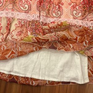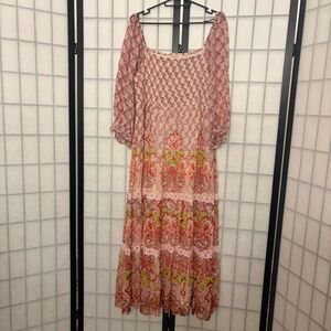 Derhy pink romantic flowing boho beaded tiered midi dress w sheer puff sleeves