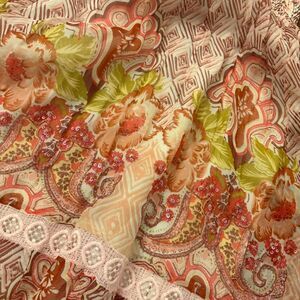 pink, tan, orange and green rustic geometric pattern with sequin and beaded details