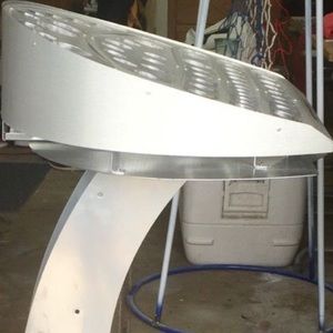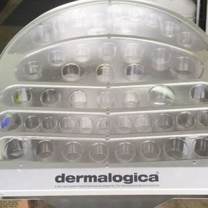 Dermalogica Product Stand. Metal with plastic molds. Plastic molds are removable and can be easily cleaned. Holds up to 46 products of different sizes.