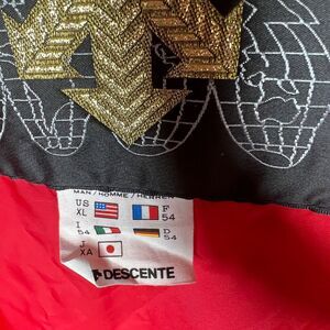 Descente a gorgeous rare to find unisex Men’s or Women’s Vintage Red Retro Ski Snow Winter Parka Jacket in size US XL. This mid-length jacket features a solid red outer shell with gold accents like buttons, zippers, embroidery, and a logo. It has long sleeves, a full zip closure with buttons and snaps, an elastic adjustable waist, collared neckline, inner pockets, and outer pockets. The jacket is designed for winter and has a retro ski theme.
