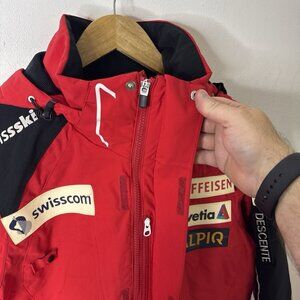 Official Descente Swiss Ski Team jacket, style S041WSSJ81 (2013). Features Swisscom, Raiffeisen, Audi, and Helvetia sponsor patches, detachable hood, and full technical ski design. Women’s Medium.