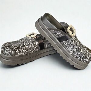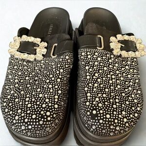 Elevate your style with these black platform mules. The chunky sole and rhinestone embellishments not only add the perfect touch of glamour to any look. Complete with a rhinestone belted accent, these slip-ons are the perfect addition to your wardrobe!