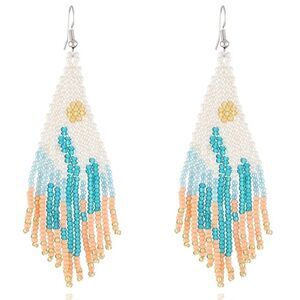 Handmade Dangling Native Southwestern Aztec Desert Cactus Cacti Pattern Beaded Fringe Tassel Seed Bead Bohemian Statement French Wire Drop Hook Earrings