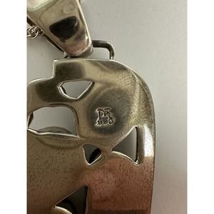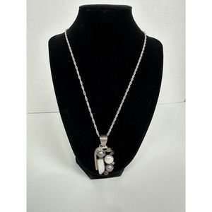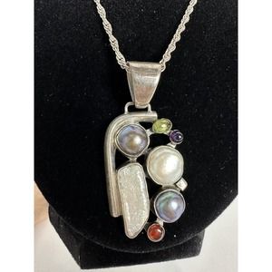 This pendant is in a abstract formation set in a sterling silver. The stones are pearl and ruby.