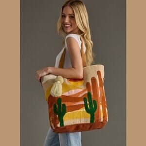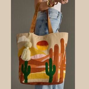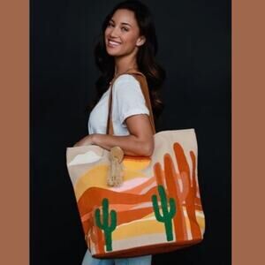 Desert Scene Tote Bag Southwest Cactus Pom Tassel Cotton Boho Western NEW