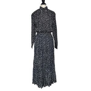 Small-medium. Top is a size small and has a relaxed oversized fit. Skirt is a size medium and has an elastic waist that can stretch to fit up to a size 32 W comfortably. Please refer to pictures for additional approximate measurements before purchase. Measurements may differ from size tag. Measurements are measured from flat lay.