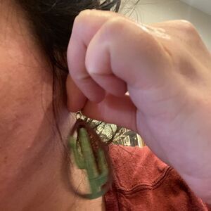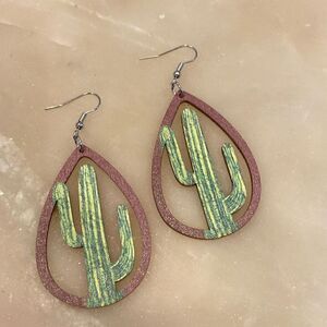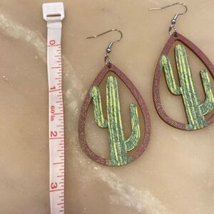 Desert cactus wooden teardrop earrings. Earrings are brown and green. Earrings drop approximately 3 inches below the earlobe. New with tags in my boutique
