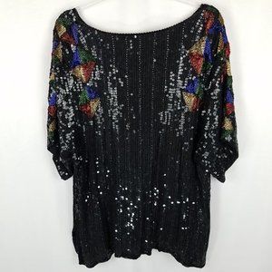 Design Assets Women top black silk lined beaded and sequined VTG. black sequins in a vertical row on black silk with multicolor beaded diamonds on front, down sleeves and top back. short batwing sleeves. vee neck/hem/sleeve ends edge-beaded. 4" slit on each hem side. great for party with black slacks or fun everyday with jeans.