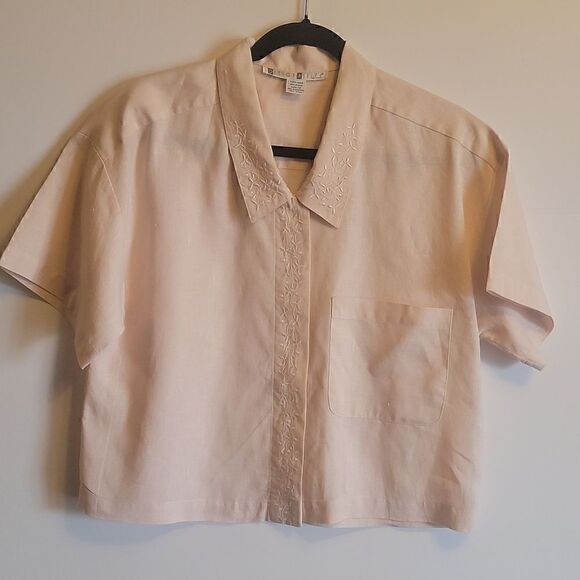 Design Assets Linen pink cropped top size 12. Brocade around neck and middle.