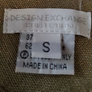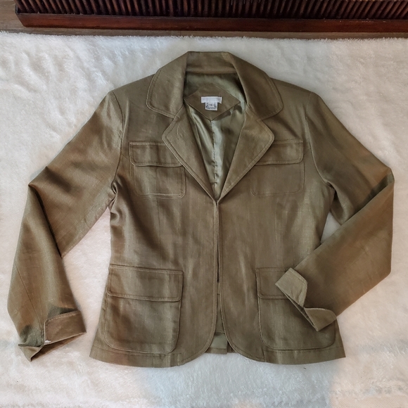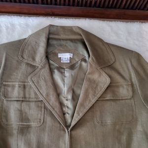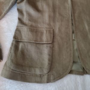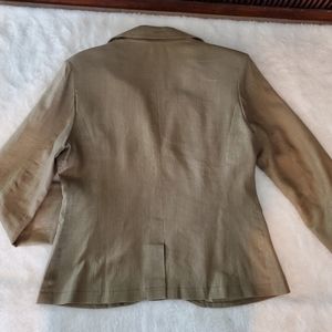 Design Exchange Collection Jacket. Green with a gold sheen. One hook closure. Cuffedsplit sleeves. 2 breast pockets, 2 waist pockets. Rear split. Lined. Linen/viscose. Dry clean. Great with jeans or dressed up for an evening out. Small.