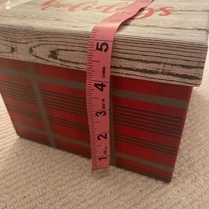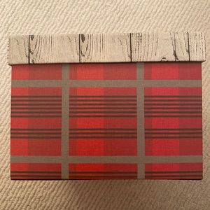 Simple holiday gift box that reads HAPPY holidays in red against a faux gray wood back-drop. The sides are plaid. In perfect/new condition. Photos show all angles.