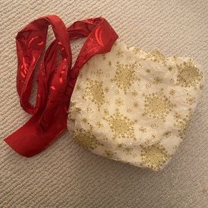 Photos 14-15, shows glittery snowflake paper still padding box bottom & red ribbon (ribbon cannot be doubled around box) that I will send with it to use or discard