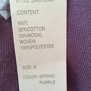 This soft and lovely NWT lavender shark-bite sweater from Design History has a unique feature -- a sheer white attached "skirt" that gives the sweater an elegant look. It's as though you have the bottom portion of a sheer blouse underneath, without the bulkiness of actually wearing a blouse. Measured flat: Width across underarms 16.5", Length: Total: 27.5" center and 32" sides (Sweater section alone at center 20.5", sides 24"/Skirt alone at center, 7",sides 8"). Fabric: Knit-50% Cotton 50% Modal; Skirt: 100% polyester. Extra thread included.
