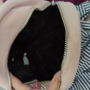 Perfect condition Design Lab backpack, unworn. pretty soft rose pink with flower embroidery. Inner zipper pocket in the main pouch and outside smaller pocket, also zippered. Shell is 100% velvet, lining is 100% polyester.