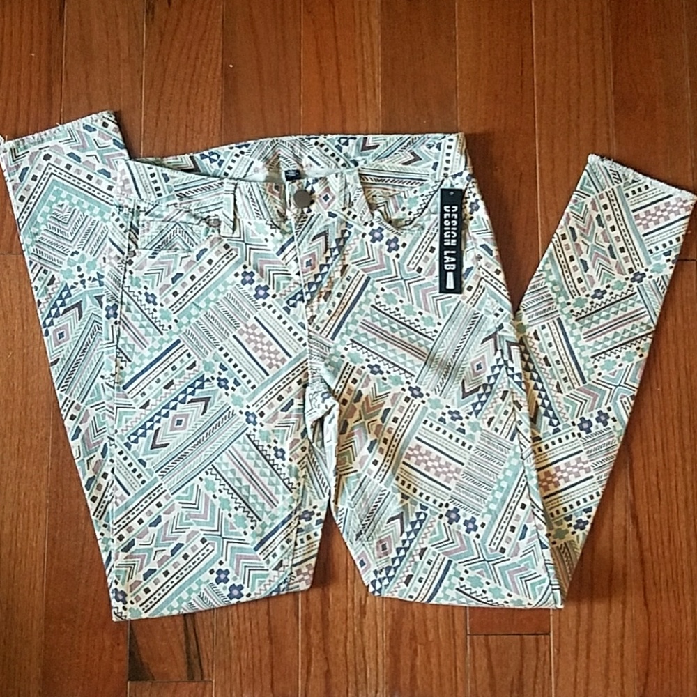 Aztec print skinny jeans. Rip detail at knee.