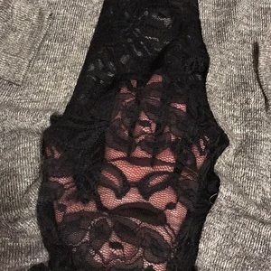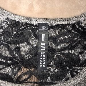 Long sleeve grey knit with gold accent, black lace underlay. Open back. Worn two-three times.
