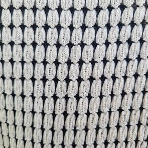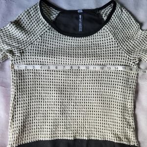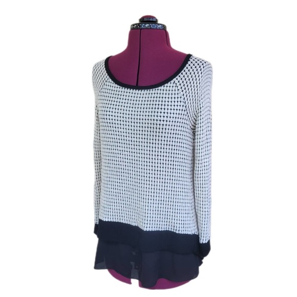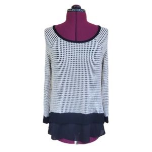 Design Lab Lord &Taylor, size XS, ivory and black split back lightweight sweater with a layer of black chiffon underneath. Chiffon lines the body and is visible bellow the front hem and in the back where the sweater is split. Intricate textured waffle knit pattern. Scoop neckline. Hi Low hem. Excellent Used Condition.