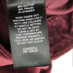 Wine/burgundy velvet jeans with raw edge at pant legs hem is a distinctive feature (and not a flaw). Five pocket design. Great color for the winter holidays.