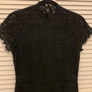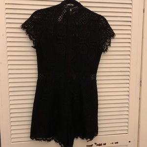 Black lace romper from Design Lab. Short sleeve with high neck. Zipper down half length of back. Top and one part of middle of romper is see-through. Perfect for a night out or a special occasion! Very special piece!