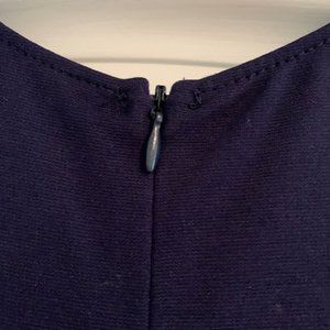 This dress is navy blue with white and light blue strips on the skirt part. It has short sleeves and a crew neck. Material is a little stretchy. Worn only once and in great condition.