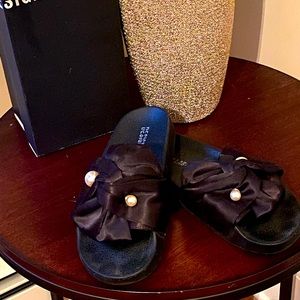 Size 7 Black Slides Accepted with Pearls. Perfect for a summer day at the beach or simply strolling around town. Worn but still in pristine condition.
