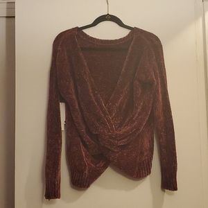 Brand new with tags Design Lab sweater from Lord & Taylor. The sweater is open on the back. Very soft material and certainly will make a statement. Color is a mis between burgundy and purple. Size is medium.
