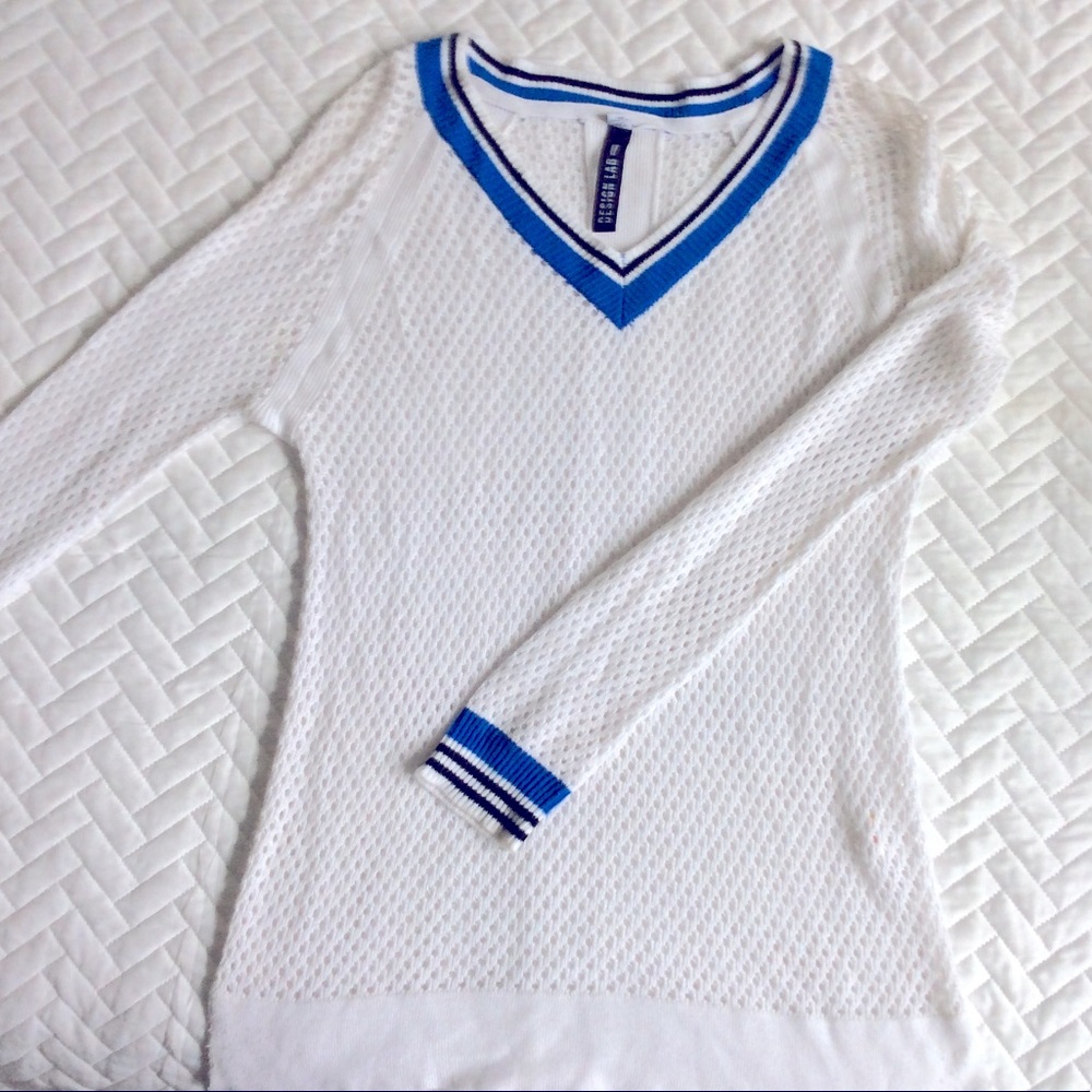 Knit sweater, ideal for spring or summer, warm climate year round piece. Works great as work/casual/sporty. Blue trim