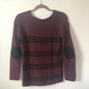 Very comfortable oversized Burgundy and Black striped sweater. Black suede patches on the elbows. Only worn a couple times, looks new. (fits like a small)