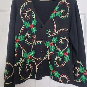 Design Options by Philip and Jane Gordon Womens Beaded Sequin Holly Berry Holiday Cardigan Sweater Sz XL