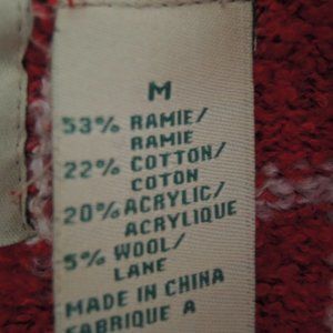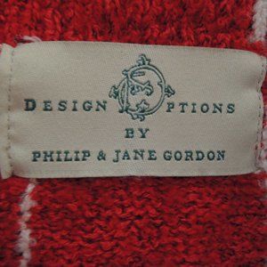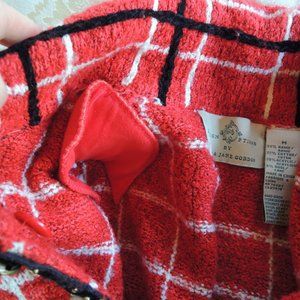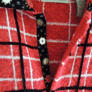 Vintage Design Options by Philip & Jane Gordon red, white & black windowpane cardigan, size Medium. Cheerful, boxy, jacket-style sweater is soft and fuzzy knit, with red background and black & white plaid stripes. Long sleeves, two front pockets, very thin interior shoulder pads. Black velvet collar and pocket trims are embellished with festive folk art style buttons, sequins & beads. Brass-look button closure on front, pockets have snap closure. A few areas of pilling and several loose black threads (example in last 2 pics), but overall in good gently pre-owned condition.
