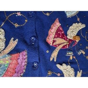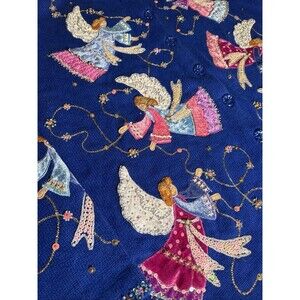 * Gently used, but does have some minor flaws: One of the angels is missing the star sequin at her waist-she is the blue one at the top and picture #5. The left sleeve is missing a stat/beads and is shown in picture #6. Back is missing a sequin and is shown on picture number #13.