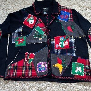 Design Originals Studio Joy Christmas Sweater Women's P/Medium Cardigan Elbow Patch Black Plaid Patchwork EUC