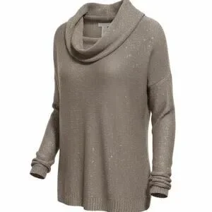 Soft, subtly sparkly, and easy to style—this Design History tunic sweater is a beautiful neutral with delicate shine. It’s a loosely knit taupe knit sprinkled with tiny silver sequins, giving just enough glamour for dinners, events, or everyday chic. The draped cowl neckline and relaxed fit make it comfy over tanks or camis, and the longer tunic length is great with leggings, slim pants, or straight jeans.